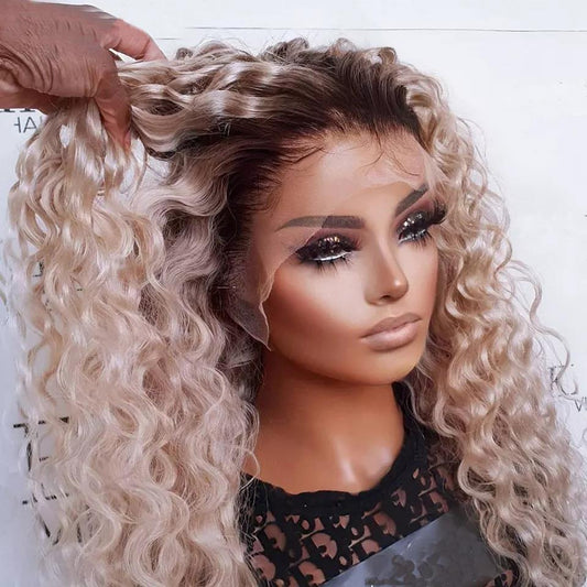 Trina White Blonde with Soft Dark Roots Curly 100% European Virgin Remy Grade 12A Hair Lace Frontal Wig f