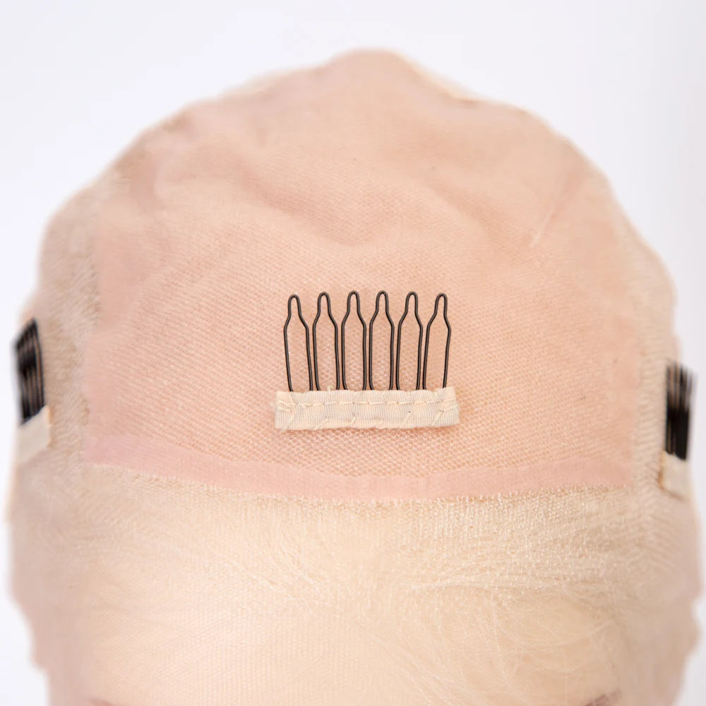 Angie White Blonde features 10A grade, cuticle-aligned, hand-tied hair with invisible knots, crafted from 100% virgin European hair. This 5x5 silk top offers a full lace design with a pre-plucked hairline and an elastic band for secure fit. Available in densities of 130%, 150%, and 200%, it ensures a natural look and premium quality for expert styling.